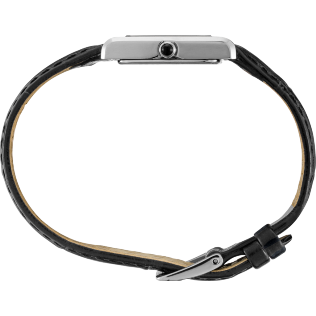 From the Essentials Collection. Offering classic designs, the Essentials Collection provides the ideal solution for everyday wear. Crafted of stainless steel in gold-tone finish, this elegant watch, with sophisticated rectangular case, features a traditional white dial with Roman numerals and finely shaped hands, cabochon crown and black leather strap for perfect day-to-evening style. 3 bar, 30M Water Resistant
